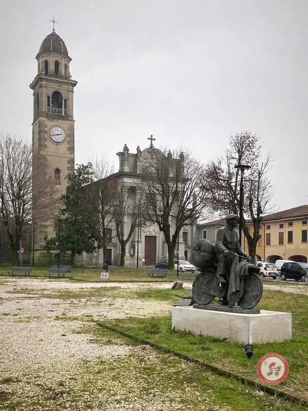 Finita la pausa inforchiamo la bici e seguiamo l’argine dell’Oglio fino a Villa Rocca, antica dimora purtroppo in decadimento, ma è affascinante la torre con l’arco affrancato alla Chiesetta di questo piccolo borgo agricolo, una foto e via di ritorno, attraversiamo Pescarolo e poi Vescovato, dove nella piazza antistante la chiesa parrocchiale troviamo un monumento particolare che non avevo mai notato prima: un uomo col pastrano e berretto tipico del secolo scorso che su una bicicletta con porta pacchi trasporta stracci, corde rotte, un materasso vecchio: è una scultura a ricordo di un antico lavoro: “ el straser” ( il raccoglitore di stracci vecchi) che qui ha fatto storia.
